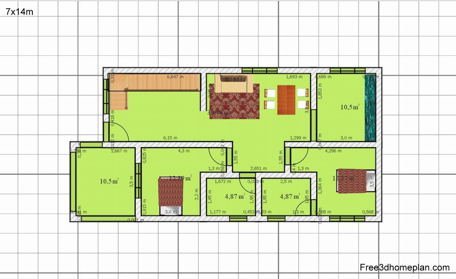 Free Download Small House Plan 7x14m Plan 2 Bedroom,American Kitchen with Car Parking