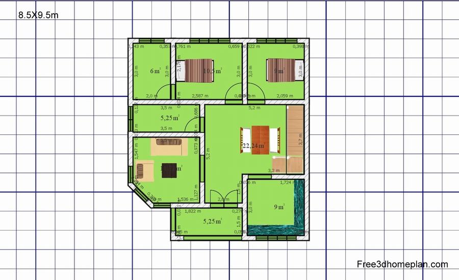 Free Download 8.5X9.5m Small House Plan with American Kitchen